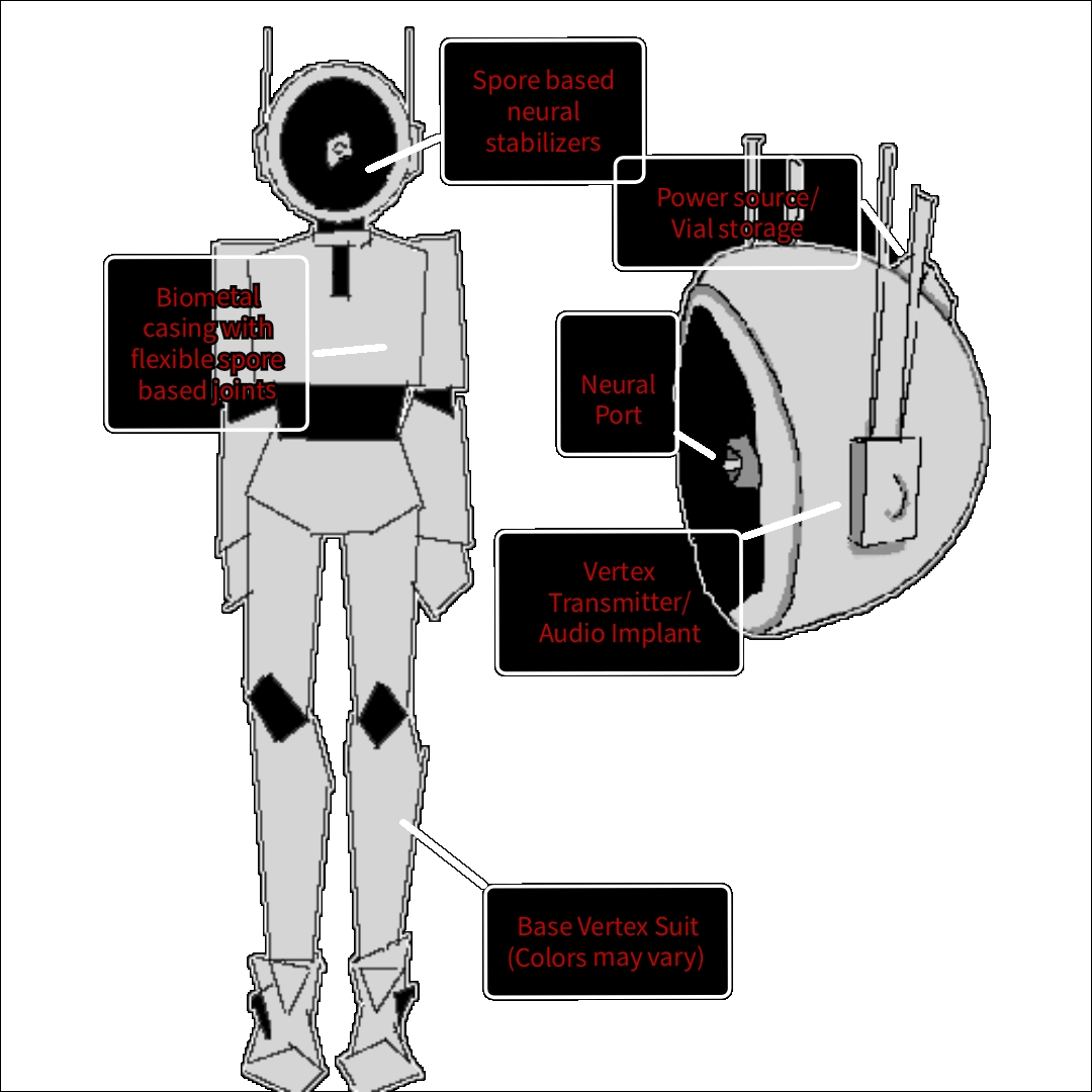 Vertex is a bio-engineered organism, by Hexahedron [Cubed], that acts as machine-powered armor.